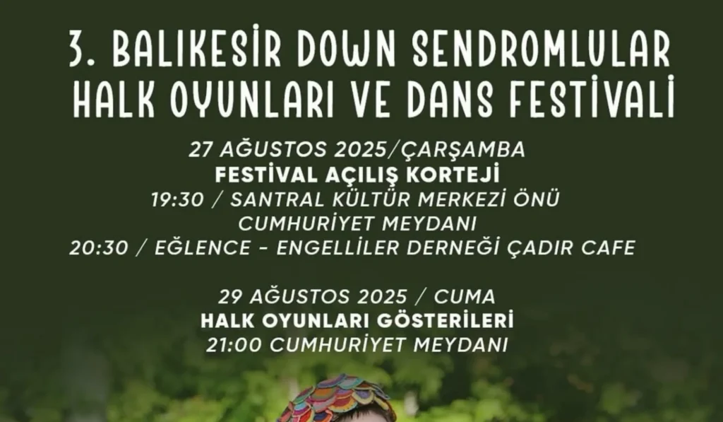 Bandırma’da 3’üncü Balıkesir Down Sendromlular Halk Oyunları ve Dans Festivali, özel bireylerin sahne alacağı etkinliklerle vatandaşları Cumhuriyet Meydanı’nda buluşturacak. Festival, 27 Ağustos Çarşamba günü saat 19.30’da Santral Kültür Merkezi önünden başlayacak açılış kortejiyle başlayacak ve Cumhuriyet Meydanı’na kadar devam edecek. Aynı gün saat 20.30’da Engelliler Derneği Çadır Cafe’de düzenlenecek eğlence programı ile festival coşkusu artacak.