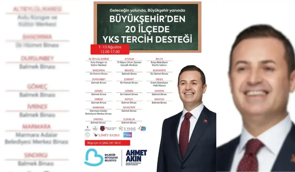 Balıkesir Büyükşehir Belediyesi, Yükseköğretim Kurumları Sınavı (YKS) tercih döneminde 20 ilçede öğrencilere YKS Tercih Merkezleri kuruyor. Eğitimde fırsat eşitliği sağlamak için YKS’ye giren öğrencilerin sınav ücretlerini karşılayan; “Günaydın Çorbası”, “Vize ve Final Haftalarında Ücretsiz Ulaşım” gibi imkânlarla öğrencilerin her zaman yanında olan Balıkesir Büyükşehir Belediye Başkanı Ahmet Akın, üniversite adaylarının hayallerine giden yolda yine en önemli desteği veriyor. Akın liderliğinde 20 ilçede kurulacak olan YKS Tercih Merkezleri, üniversite adaylarının bilinçli ve doğru tercihler yapabilmesi adına danışmanlık hizmeti sağlayacak.
