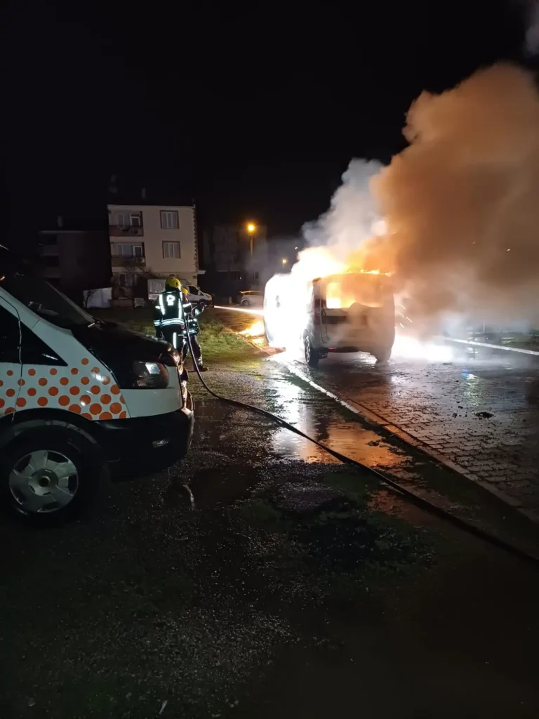 Balıkesir’in Karesi ilçesinde sabaha karşı park halindeki hafif ticari araç yandı.