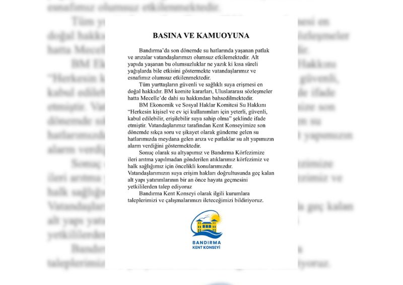 Yetkililere çağrıda bulunan Kent Konseyi, “Su altyapımız ve Bandırma Körfezimize ileri arıtma yapılmadan gönderilen atıklarımız körfezimiz ve halk sağlığımız için öncelikli konularımızdır. Vatandaşlarımızın suya erişim hakları doğrultusunda geç kalan alt yapı yatırımlarının bir an önce hayata geçmesini yetkililerden talep ediyoruz.” dedi.