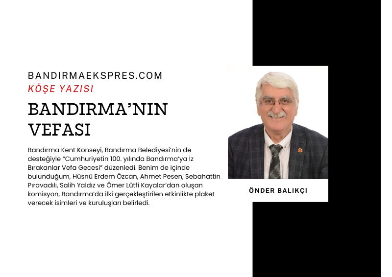 Bandırma Kent Konseyi, Bandırma Belediyesi’nin de desteğiyle “Cumhuriyetin 100. yılında Bandırma’ya İz Bırakanlar Vefa Gecesi” düzenledi. Benim de içinde bulunduğum, Hüsnü Erdem Özcan, Ahmet Pesen, Sebahattin Pıravadılı, Salih Yaldız ve Ömer Lütfi Kayalar’dan oluşan komisyon, Bandırma’da ilki gerçekleştirilen etkinlikte plaket verecek isimleri ve kuruluşları belirledi. Gecenin açılış konuşmalarını yapan Kent Konseyi Başkanı Serdar Polat ve komisyon adına konuşan Ömer Lütfi Kayalar, bu vefa gecesinin ilk olup, bir başlangıç niteliğini taşıdığının ve önümüzdeki yıllarda yeni isimlerin de belirlenmesiyle etkinliğin süreceğinin altını özellikle çizdiler.