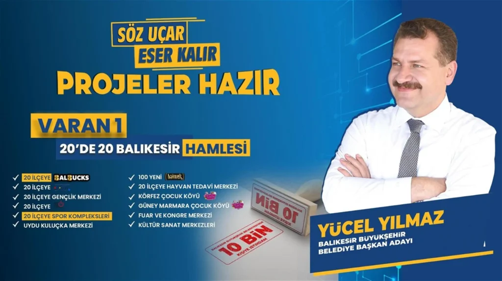 Söz uçar eser kalır Projeler hazır” diyerek 2024 – 2029 Şehir Yönetim Manifestosunu açıklayan Balıkesir Büyükşehir Belediye Başkanı Yücel Yılmaz, belediye şirketlerinde yapılacak istihdam müjdelerini bir bir açıkladı. Konuşmasının ardından projelerini sıralayan Başkan Yücel Yılmaz, ilk olarak Varan 1 başlığı altında “20’de 20 Balıkesir Hamlesi”ni anlattı. 20 ilçenin tamamına; BALBUCKS, Dijital Gençlik Merkezi, NE10, spor kompleksi, Uydu Kuluçka Merkezi ve Sokak Hayvanları Tedavi Merkezi kuracaklarını ifade eden Başkan Yılmaz ayrıca hobilerin ticarete dönüşmesine olanak sağlayacak 100 yeni BALMEK açacaklarını söyledi. Körfez ve Güney Marmara bölgelerinde de birer Çocuk Köyü oluşturacaklarını belirten Başkan Yılmaz; Ayşebacı Mahallesi yakınında bir Fuar ve Kongre Merkezi ve şehrin farklı bir noktasında da Kültür ve Sanat Merkezleri oluşturacaklarını ifade etti.