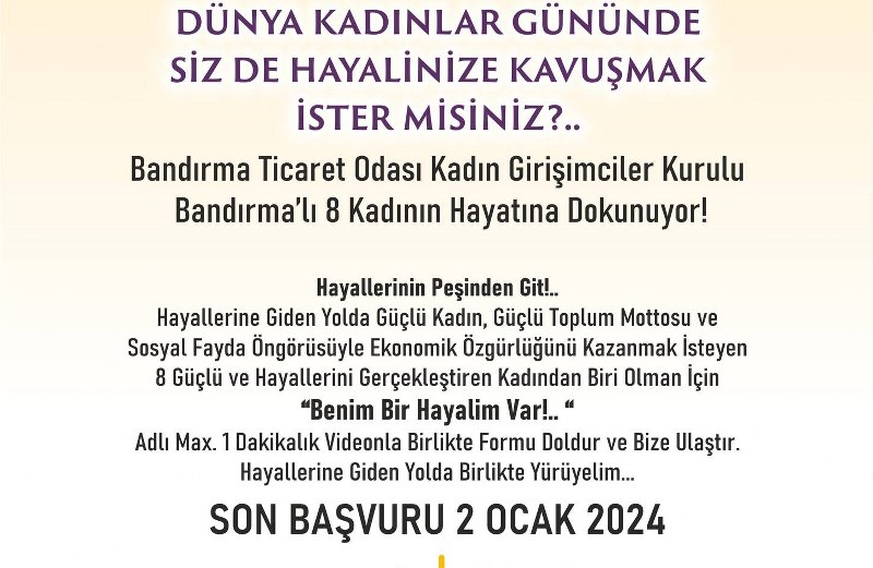 Bandırma Ticaret Odası Kadın Girişimciler Kurulu, düzenlediği kampanya ile Bandırma’da yaşayan 8 kadının hayatına dokunmayı hedefliyor. “Hayallerine Giden Yolda Güçlü Kadın, Güçlü Toplum” mottosuyla hayata geçirilen kampanyaya başvuruda bulunmak isteyen kadın girişimcilerin “Benim Bir Hayalim Var” isimli formu doldurması gerekiyor. Kampanya başvuru süreci 15 Ocak tarihinde son bulacak.