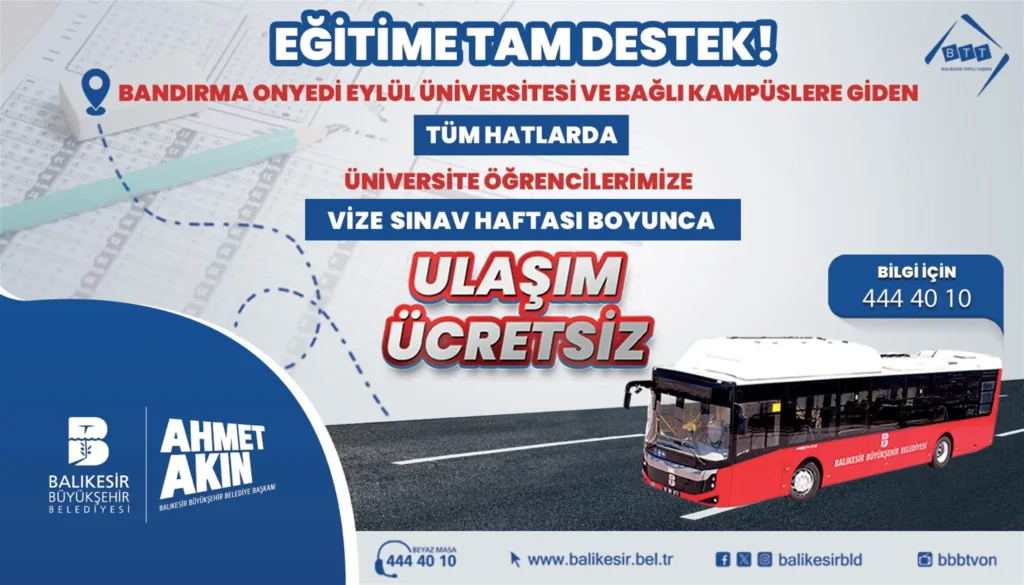 Balıkesir Büyükşehir Belediyesi, eğitime tam destek vermeye devam ediyor. 20-28 Nisan günleri arasında Bahar Yarıyılı vize sınavlarını gerçekleştirecek olan Bandırma Onyedi Eylül Üniversitesi’nde okuyan öğrenciler de Büyükşehir Belediyesi iştiraki Balıkesir Toplu Taşıma AŞ’ye ait toplu taşıma araçlarıyla ücretsiz olarak okullarına ulaşımlarını sağlayacak.
