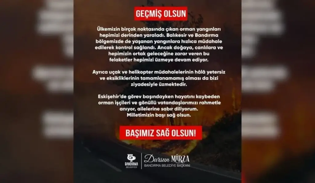 Bandırma Belediye Başkanı Dursun Mirza, çıkan orman yangınlarıyla ilgili yaptığı açıklamada, müdahale eksikliklerine dikkat çekerek hayatını kaybedenler için başsağlığı diledi.