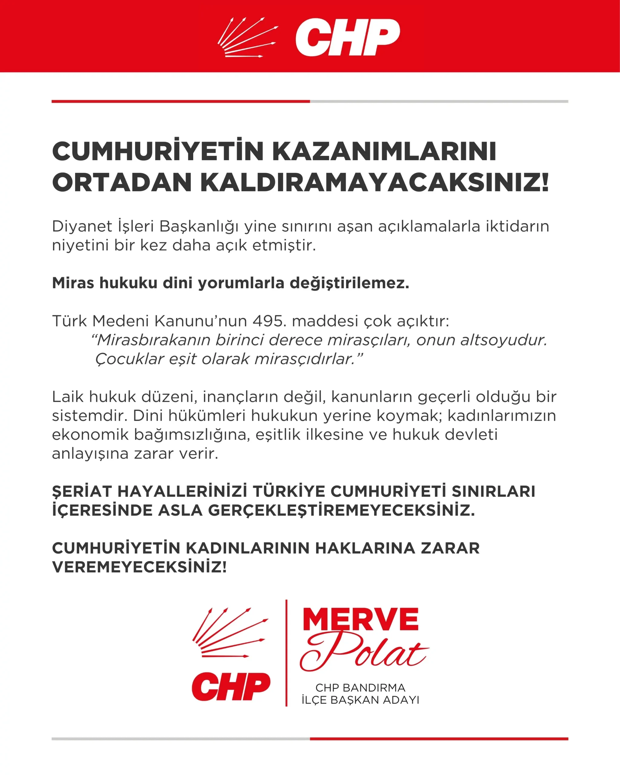 CHP Bandırma İlçe Başkan Adayı Av. Merve Polat, bugün Diyanet İşleri Başkanlığı’nın cuma hutbesinde miras hukuku üzerine yaptığı açıklamalara tepki göstererek “Miras hukuku dini yorumlarla değiştirilemez” dedi.