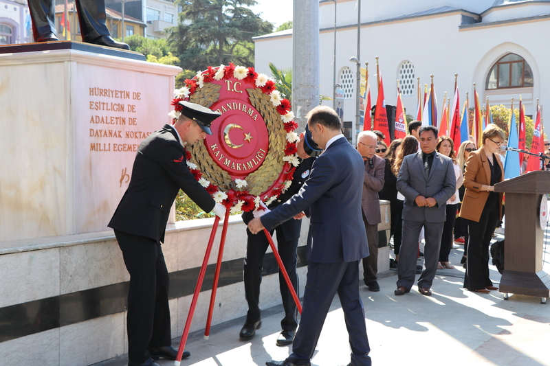 L İskele’de gerçekleştirilen ilk törende römorkör ile gelen öğrenciler Atatürk’ü temsil eden Türk Bayrağı’nı Kaymakam Engin Aksakal’a teslim etti. Cumhuriyet Meydanı’ndaki tören ise Atatürk Anıtı’na çelenklerin sunulması, saygı duruşu ve İstiklal Marşı ile başladı. Ardından Bandırma Belediye Başkanı Tolga Tosun, günün anlam ve önemine dair konuşmasını gerçekleştirdi. Tosun, “Atatürk, şehrimizde gezerken, 2 yıldan fazla işgal altında kalan Bandırmamızdaki işgalin izlerini gördü. Sonra hepimizin hafızasına kazınan konuşmasında; “Milletimiz çalışkandır! Bu fazileti taşıyan Bandırmalıların en kısa zamanda şehirlerini imar edeceklerinden, halen barut ve is kokan bu güzel beldeyi mamur hale getireceklerinden hiç şüphe etmiyorum” dedi. Cumhuriyetimizin kurucusu Büyük Önderimiz Atatürk’ün güvenine layık olmak için bizlerde en doğru planlamalarla, Bandırmayı; yaşamaktan mutlu olunan, çağdaş, zengin, huzurlu bir kent olarak geleceğe taşımak için gece gündüz demeden çalışıyoruz.”dedi.